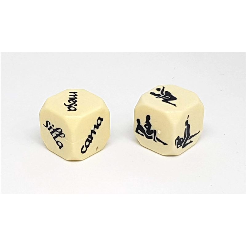 Dos dados, uno con diferentes posiciones para tener relaciones sexuales y otro con lugares de la casa donde realizarla.