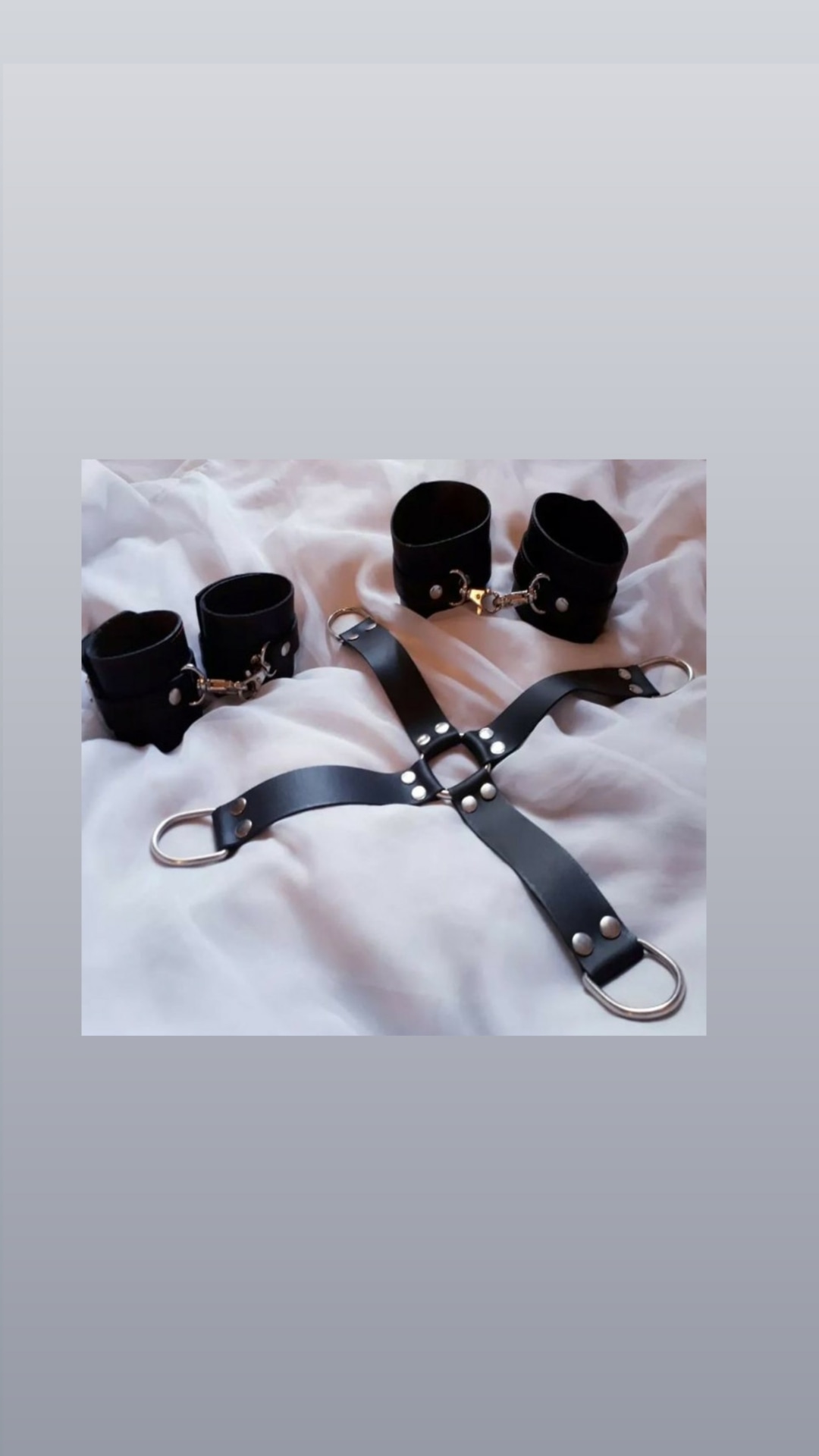 Cuatriesposa de cuero genuino, conformada por cuatro esposas dobles cosidas unidas entre sí mediante mosquetones y aros de primera calidad. Se prenden y desprenden para usarlas a gusto.